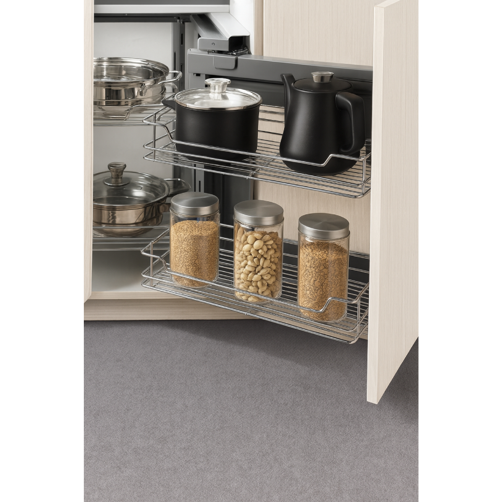 Esquina mágica, adecuada para apertura a la izquierda y a la derecha, con cestas de alambre redondas, para tableros de 16 y 18 mm, con tornillos.